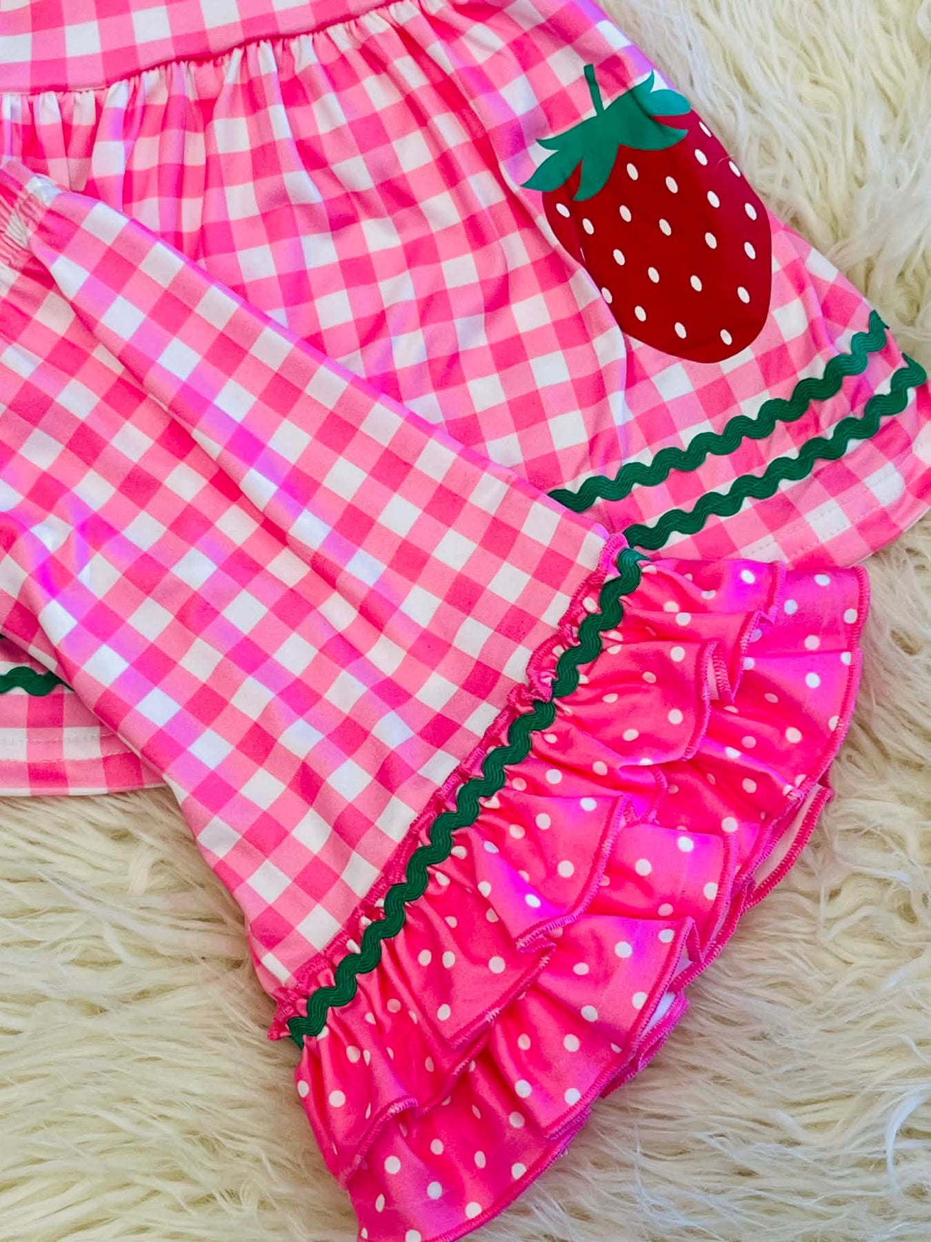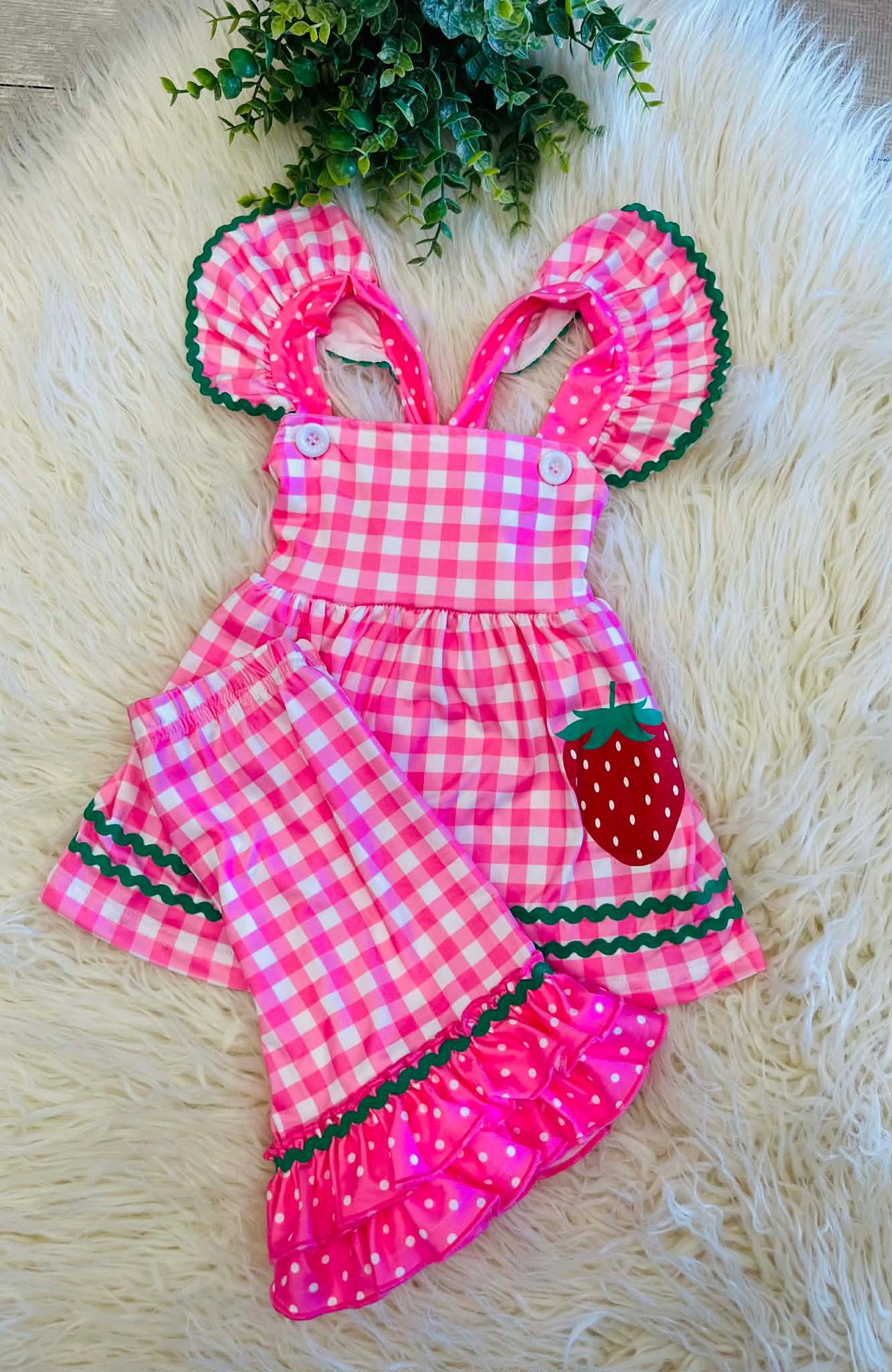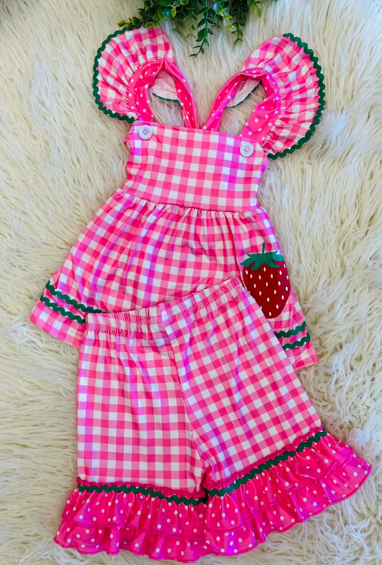 The Gingham & Berries Ruffle Outfit features a strawberry design that offers a visually appealing, seasonal aesthetic. The combination of gingham and ruffles enhances breathability and comfort, making it suitable for warm weather. This outfit promotes ease of movement, essential for active wearers.