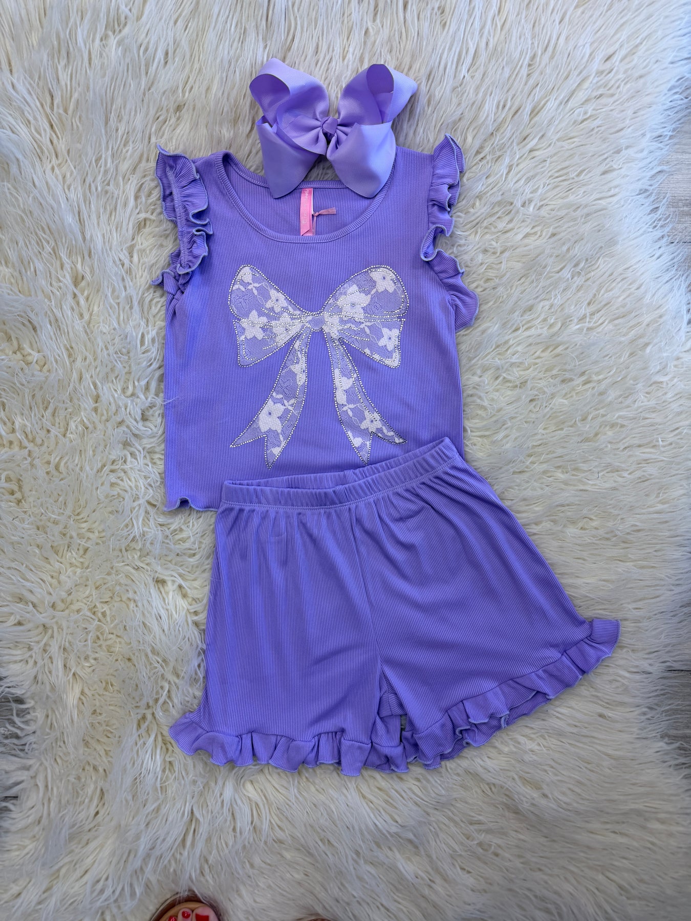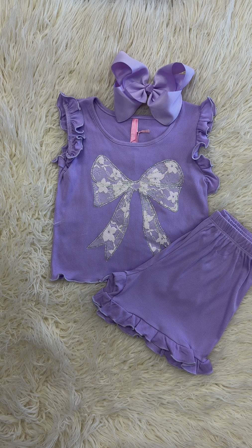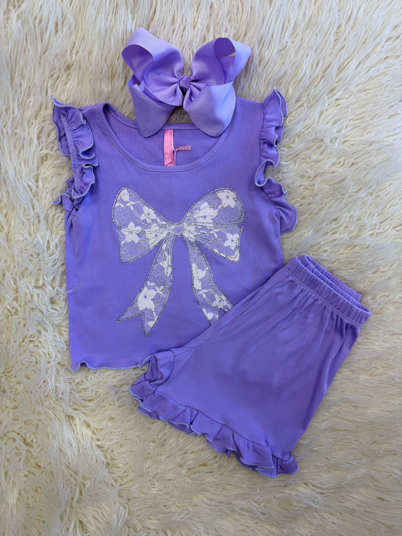 The Girls Lavender Bow Detail Short Outfit is a coordinated set designed for comfort and style. Its lightweight fabric promotes breathability, making it suitable for warm weather. The bow detail adds a touch of elegance, appealing to both aesthetic and functional preferences in children's fashion.